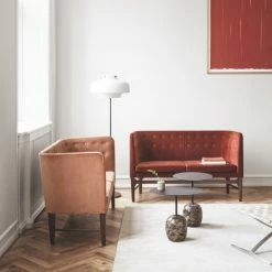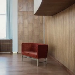 In 1939 Arne Jacobsen and Flemming Lassen won an open competition to design a new town hall, a new library, and a theatre in Søllerød (Rudersdal). For the town hall, they designed a wedding room with accompanying furniture – including a sofa for the waiting area for the couple to sit in before getting married. Designed for solemnity, the appearance of the sofa was shaped with high vertical backs and sides.